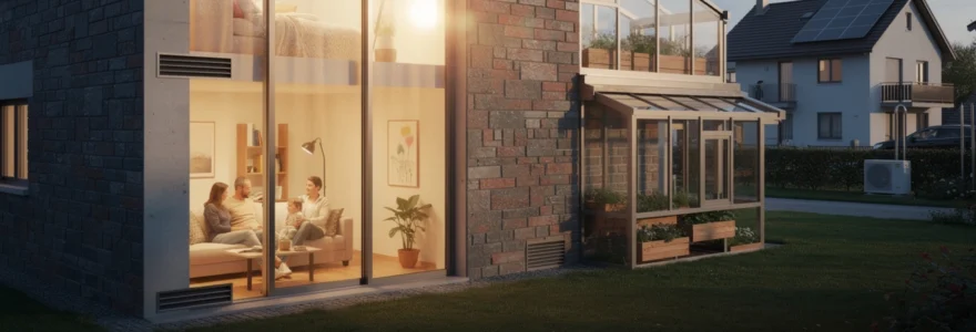 Ce type de configuration est particulièrement intéressant pour les pièces de vie orientées plein sud : séjour, cuisine ouverte, espace de travail. La serre bioclimatique permet déjà de réduire les besoins de chauffage par simple effet de serre, et le mur Trombe vient prolonger cet effet en soirée et dans la nuit. En été, des protections solaires (stores extérieurs, brise‑soleil, végétation à feuilles caduques) ainsi qu’une ventilation nocturne doivent impérativement être prévues pour éviter les surchauffes, sous peine de transformer la serre en « four ».